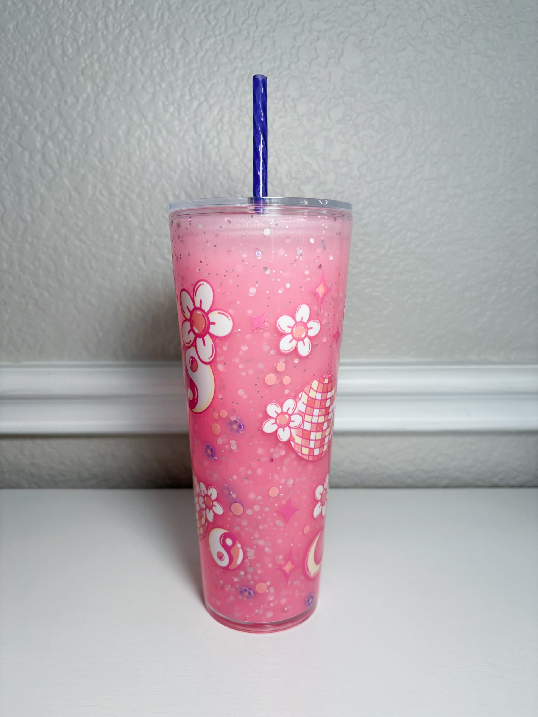 24oz Pink Vibes Slow Flow with glitter & mini clay flowers